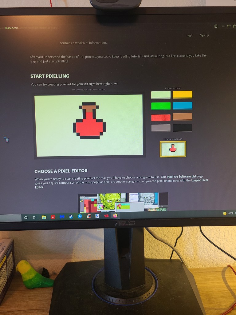 I started learning because I realized I wanted to try something new, and I absolutely love pixel art in older and current games. I have no history whatsoever in art, but I wanted to start with an art medium that I would enjoy. So I googled some beginner tips and this webpage popped up with my favorite key advice, which was just to start doing. They said one of if not the best way to improve is to just practice and start hence the very simplistic pixel art software. I used that to make four different pixel art projects and this health potion is the first of those.