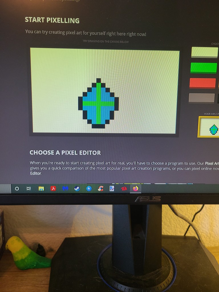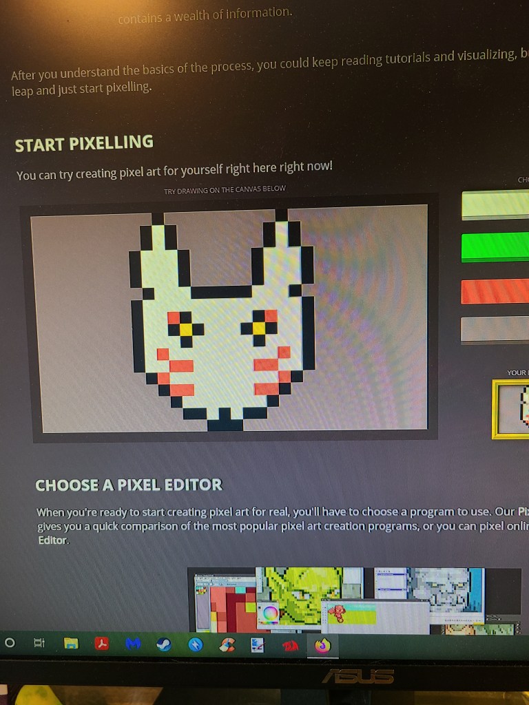 As with all things, when someone is curious or wanting to learn more you go and read up on it. Especially in this day and age when the phrase “just google it” has become so common in response to someone’s question I did just that. I googled where to start with pixel art and some beginner tutorials. This was where I found the site that had the simple pixel art creator on the front page. This led to me creating all the simple ones you see above before reading much more into tutorials. Then when I learned the limits of that, I moved on to skim some tutorials about anti-aliasing, shading, dithering, etc. Now I only skimmed these and I am unsure how to use them, but I want to learn and try to put them into practice.