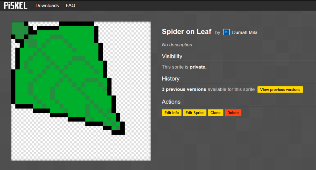 This piece itself is sort of a remake of my spider on the leaf, but I am still learning pixel art quite obviously. I want to see what I can create with a more in depth creator tool, and it has been a challenge. I went and edited the shape of the leaf about a dozen other times and even did a small edit right before posting it here today. This was also the first time I was using a reference for a piece of art that I was creating and will continue using references for the spider as well.